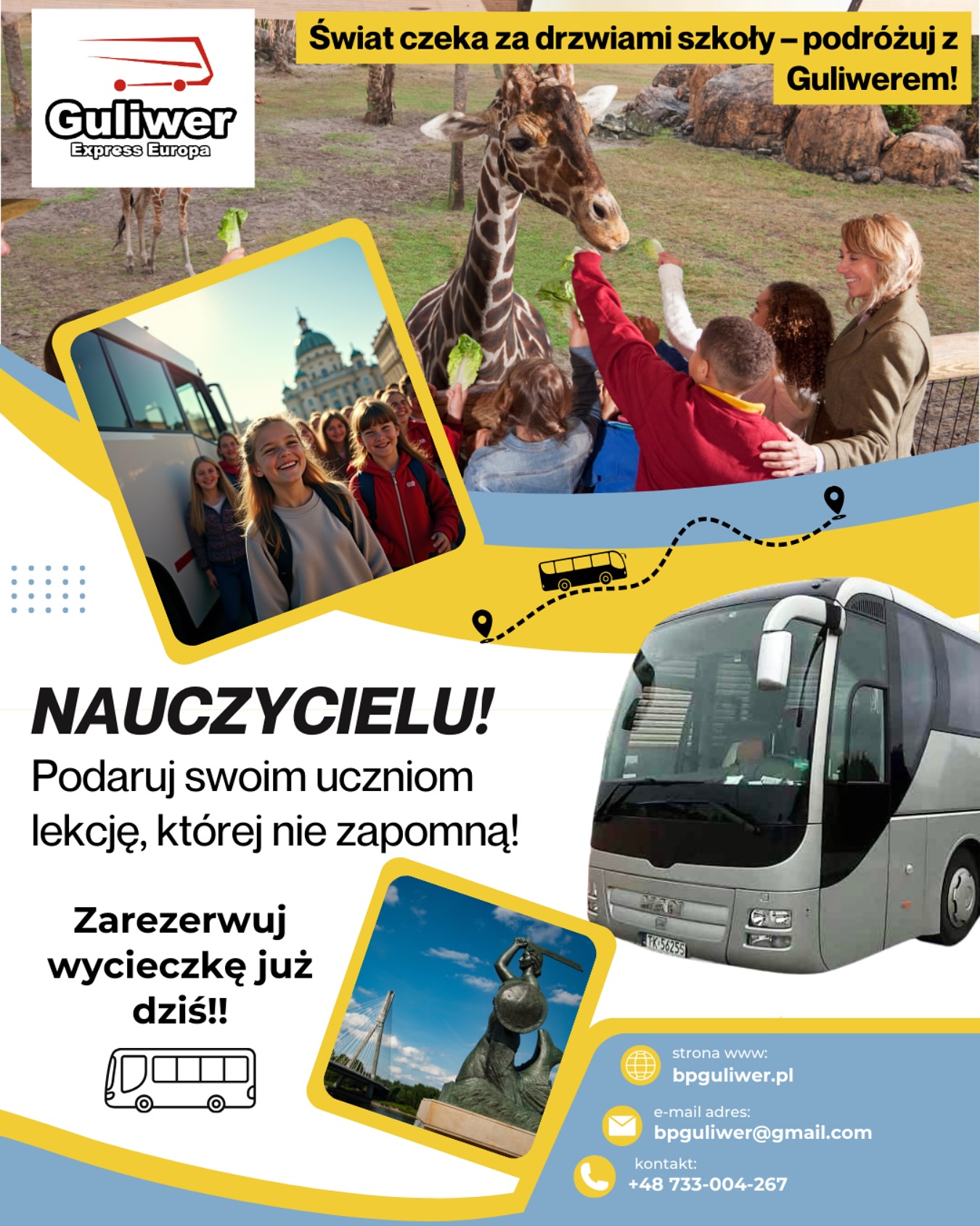 Oferujemy wyjazdy jednodniowe, dwudniowe, trzydniowe, zarówno po Polsce, jak i za granicę. W programie znajdziecie wszystko – od edukacyjnego zwiedzania miast, muzea , teatry, po wyjazdy do parków rozrywki!
