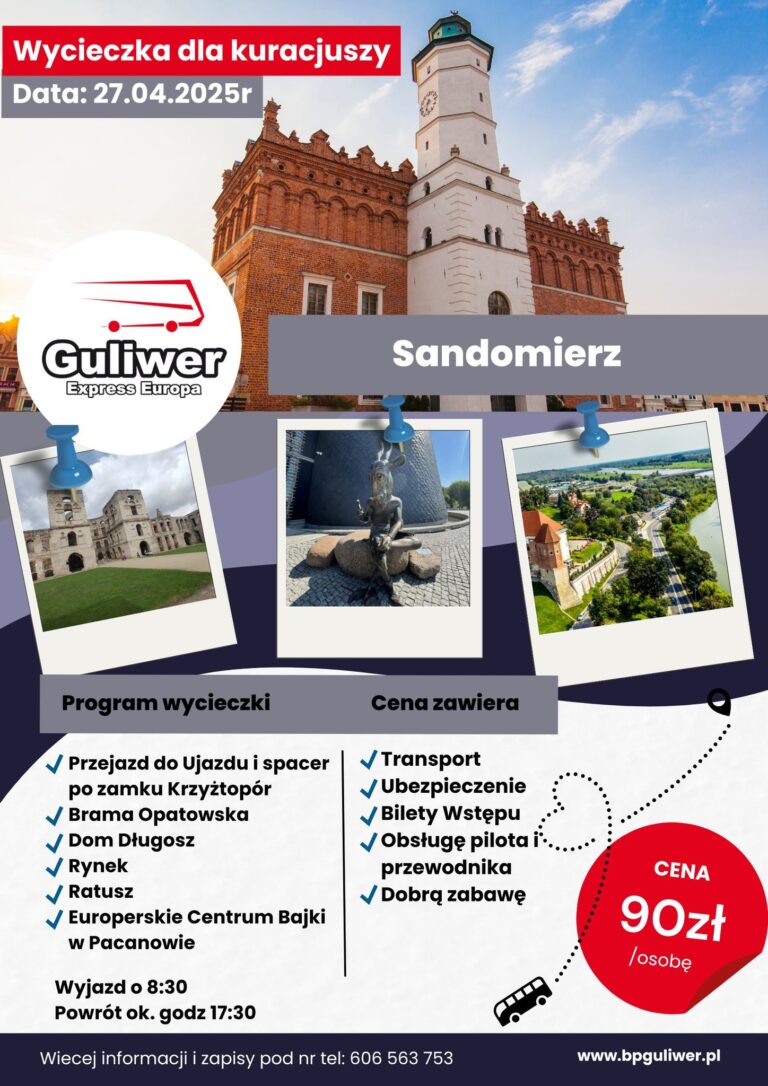 Podczas wyjazdu zwiedzimy urokliwą starówkę Sandomierza, gdzie nasz przewodnik opowie o fascynującej historii miasta i jego zabytkach. Odwiedzimy także ruiny Zamku Krzyżtopór, które przeniosą Cię w czasy dawnych legend, a czas wolny pozwoli na indywidualne odkrywanie uroków i zakup lokalnych pamiątek. Na koniec wycieczki odwiedzimy Pacanów, gdzie magia baśni spotyka się z historią.